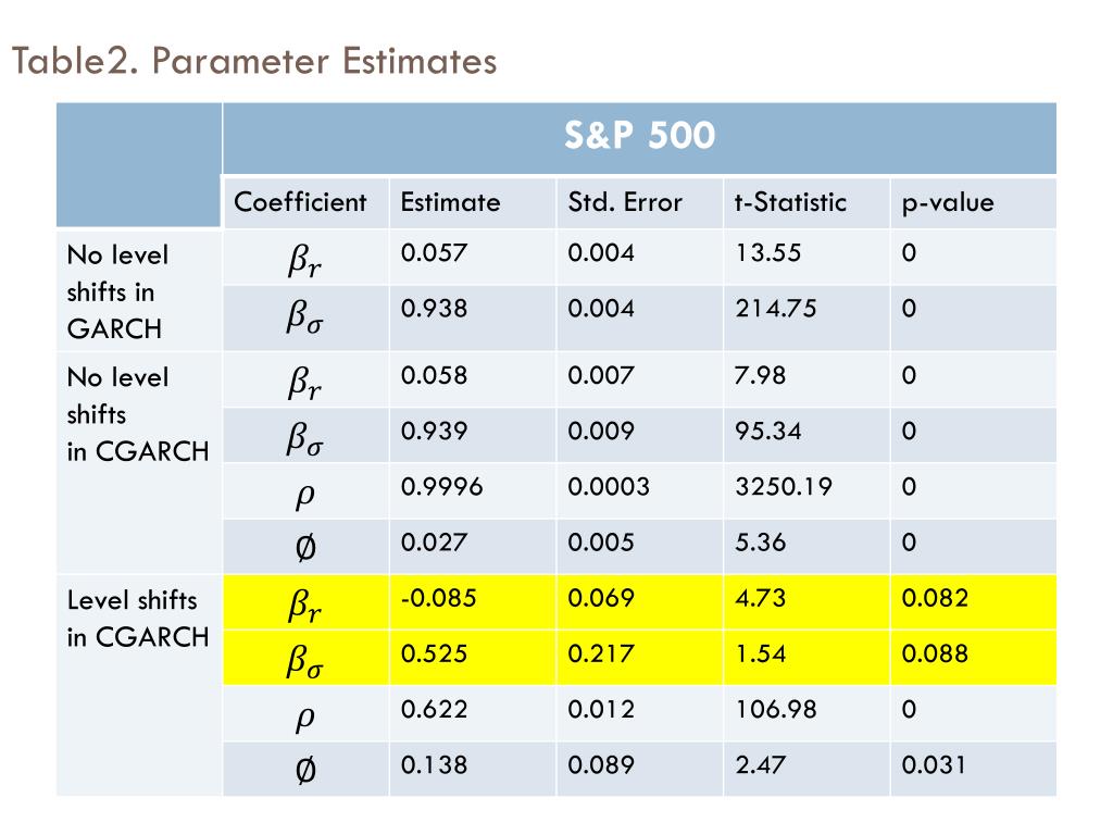 2.3.2 Effects of level shift on conditional heteroskedasticity • GARCH (1, 1) model with Student-t errors given by, for the demeaned returns process • i.i.d.Student-t distributed with mean 0 and variance 1 • the parameters of interest and measure the extent of conditional heteroskedasticity present in the data.