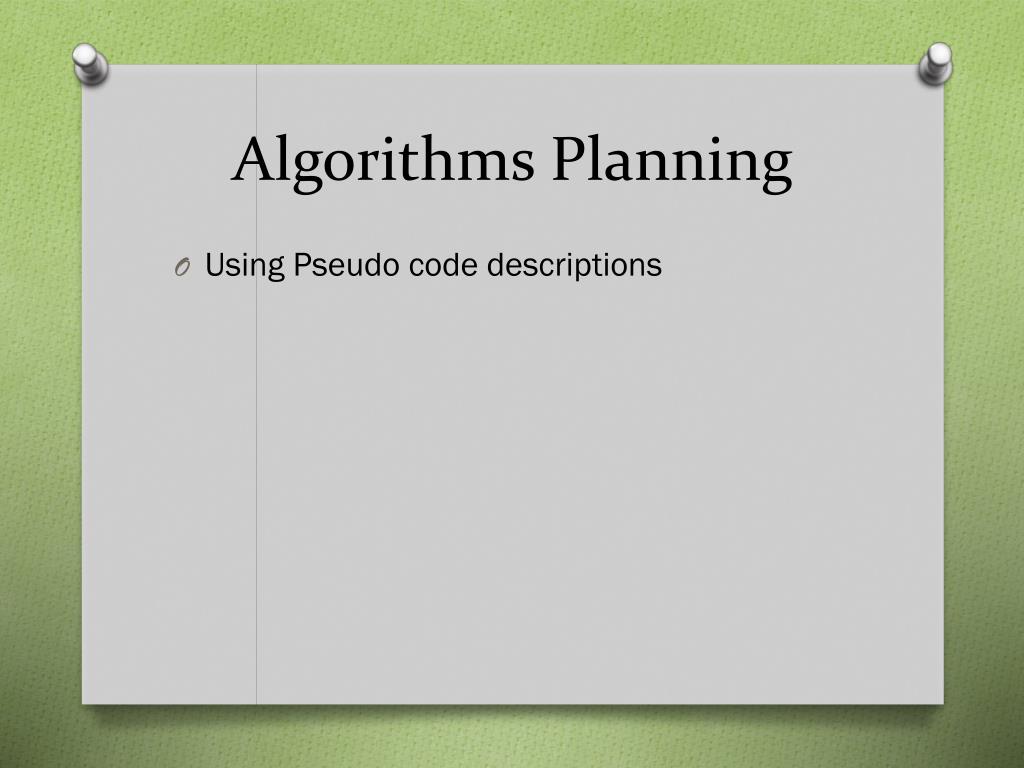 Algorithms Planning • Using Pseudo code descriptions