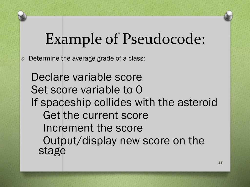 Example of Pseudocode: • Determine the average grade of a class: Declare variable score Set score variable to 0 If spaceship collides with the asteroid Get the current score Increment the score Output/display new score on the stage