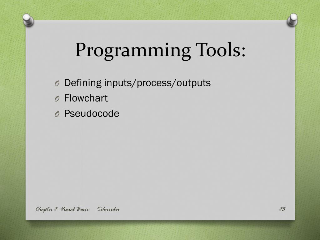 Programming Tools: • Defining inputs/process/outputs • Flowchart • Pseudocode Chapter 2- Visual Basic Schneider
