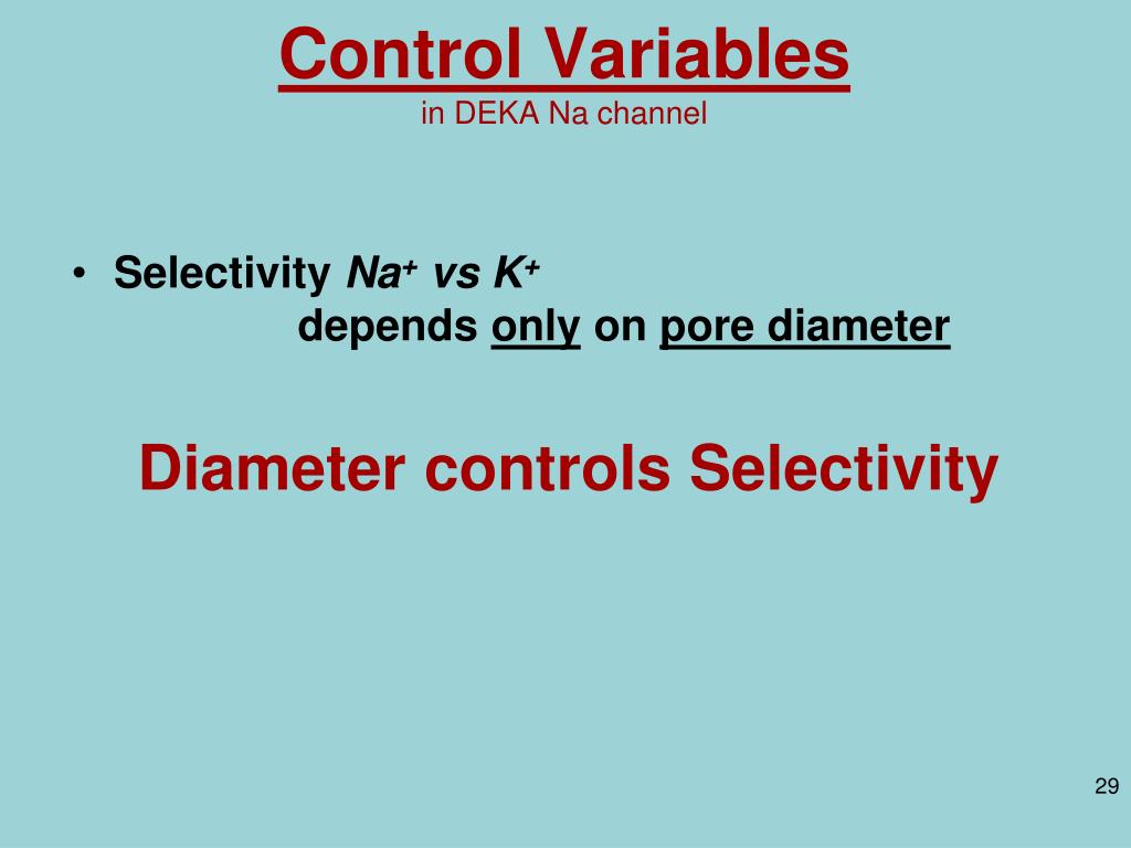 Control Variablesin DEKA Na channel • SelectivityNa+ vs K+ depends only on pore diameter Diameter controls Selectivity
