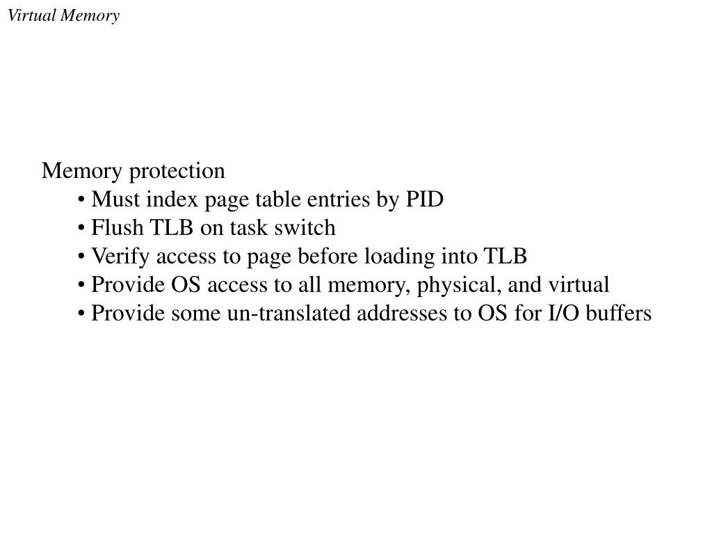 Virtual Memory • Memory protection • Must index page table entries by PID • Flush TLB on task switch • Verify access to page before loading into TLB • Provide OS access to all memory, physical, and virtual • Provide some un-translated addresses to OS for I/O buffers