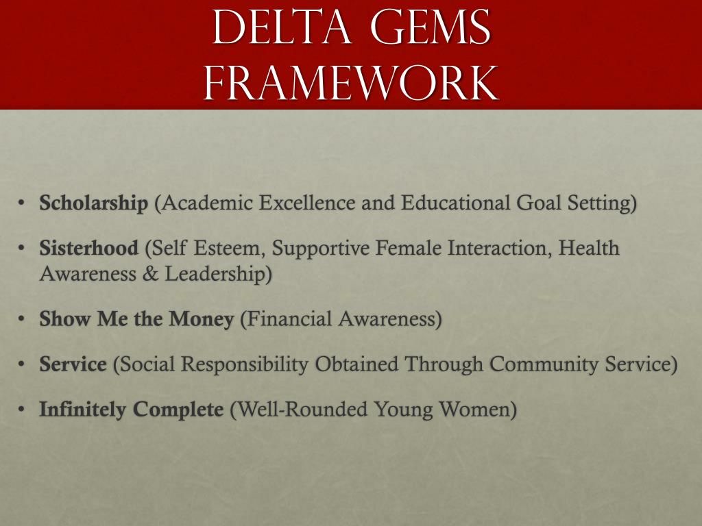 Delta Gems framework • Scholarship (Academic Excellence and Educational Goal Setting) • Sisterhood(Self Esteem, Supportive Female Interaction, Health Awareness & Leadership) • Show Me the Money (Financial Awareness) • Service(Social Responsibility Obtained Through Community Service) • Infinitely Complete (Well-Rounded Young Women)