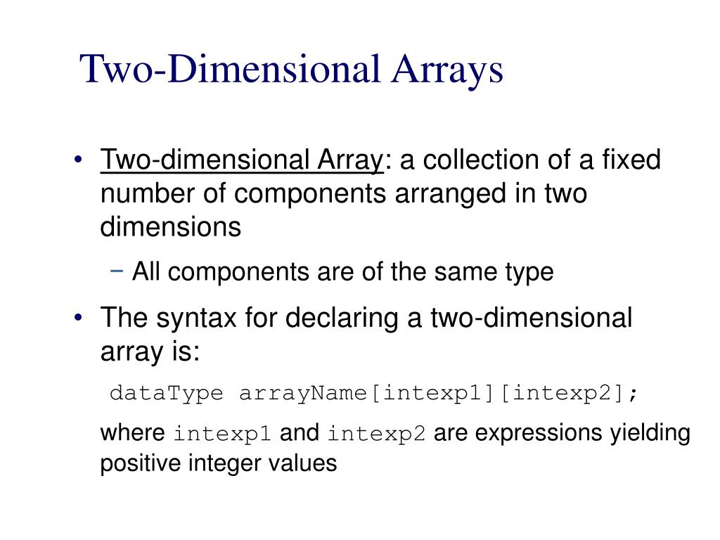 Two-Dimensional Arrays • Two-dimensional Array: a collection of a fixed number of components arranged in two dimensions • All components are of the same type • The syntax for declaring a two-dimensional array is: dataType arrayName[intexp1][intexp2]; where intexp1 and intexp2 are expressions yielding positive integer values