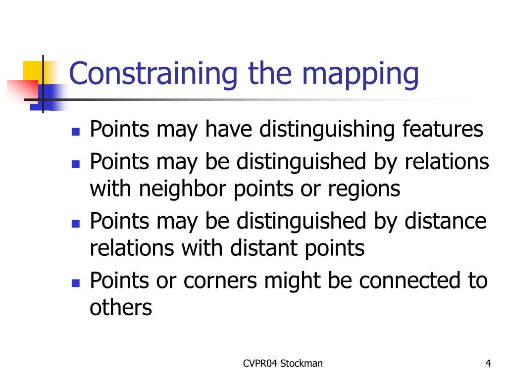 Constraining the mapping • Points may have distinguishing features • Points may be distinguished by relations with neighbor points or regions • Points may be distinguished by distance relations with distant points • Points or corners might be connected to others CVPR04 Stockman