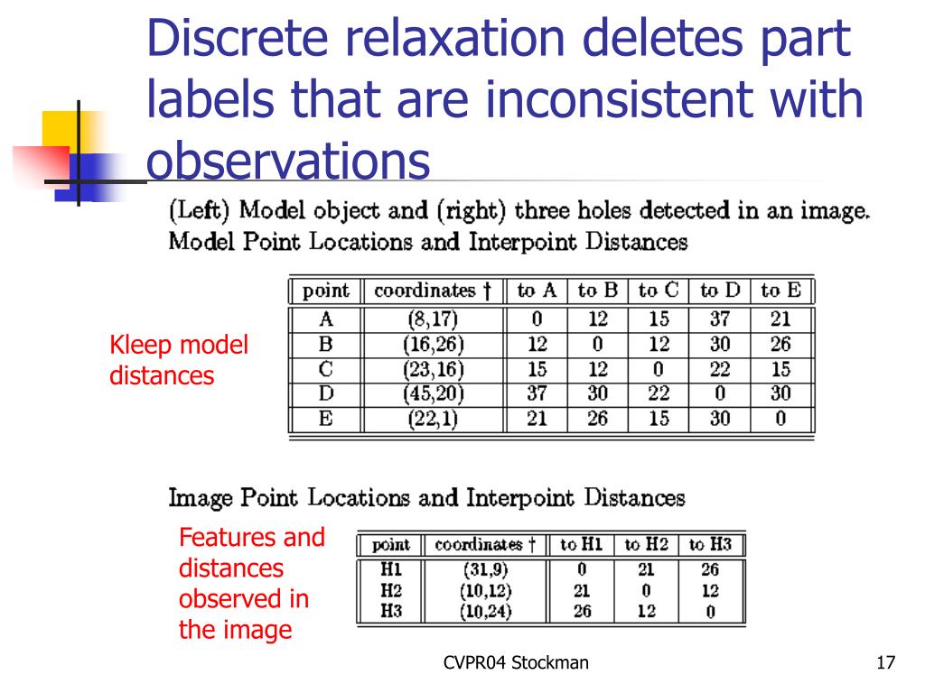 Discrete relaxation deletes part labels that are inconsistent with observations Kleep model distances Features and distances observed in the image CVPR04 Stockman