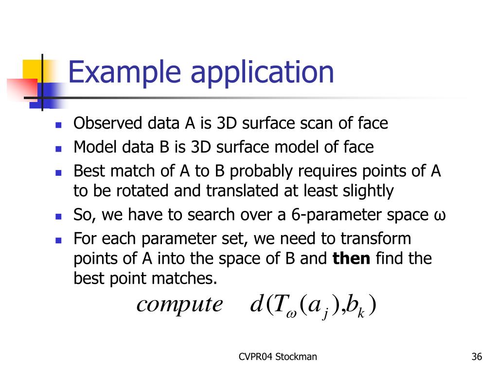 Example application • Observed data A is 3D surface scan of face • Model data B is 3D surface model of face • Best match of A to B probably requires points of A to be rotated and translated at least slightly • So, we have to search over a 6-parameter space ω • For each parameter set, we need to transform points of A into the space of B and then find the best point matches. CVPR04 Stockman