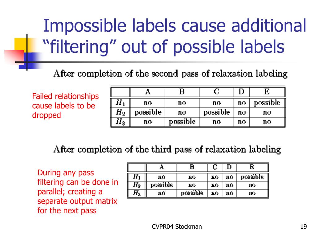 Impossible labels cause additional “filtering” out of possible labels Failed relationships cause labels to be dropped During any pass filtering can be done in parallel; creating a separate output matrix for the next pass CVPR04 Stockman