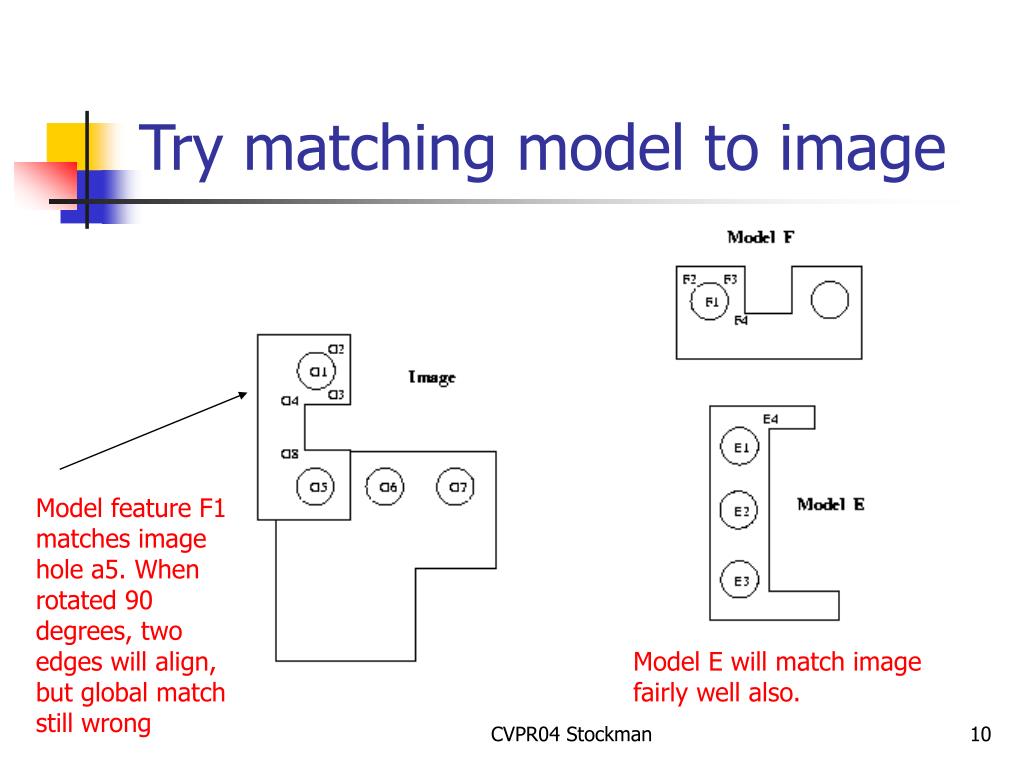 Try matching model to image Model feature F1 matches image hole a5. When rotated 90 degrees, two edges will align, but global match still wrong Model E will match image fairly well also. CVPR04 Stockman