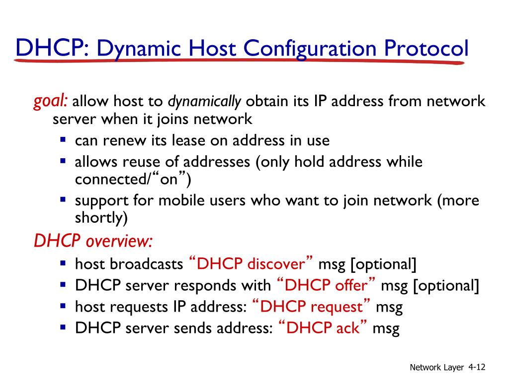 DHCP: Dynamic Host Configuration Protocol goal: allow host to dynamically obtain its IP address from network server when it joins network • can renew its lease on address in use • allows reuse of addresses (only hold address while connected/“on”) • support for mobile users who want to join network (more shortly) DHCP overview: • host broadcasts “DHCP discover” msg [optional] • DHCP server responds with “DHCP offer” msg [optional] • host requests IP address: “DHCP request” msg • DHCP server sends address: “DHCP ack” msg Network Layer