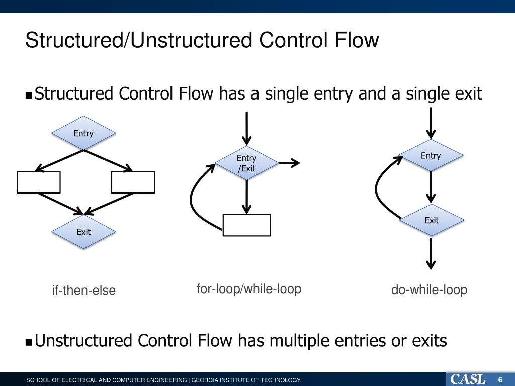 Structured/Unstructured Control Flow • Structured Control Flow has a single entry and a single exit • Unstructured Control Flow has multiple entries or exits Entry Entry Entry/Exit Exit Exit for-loop/while-loop do-while-loop if-then-else