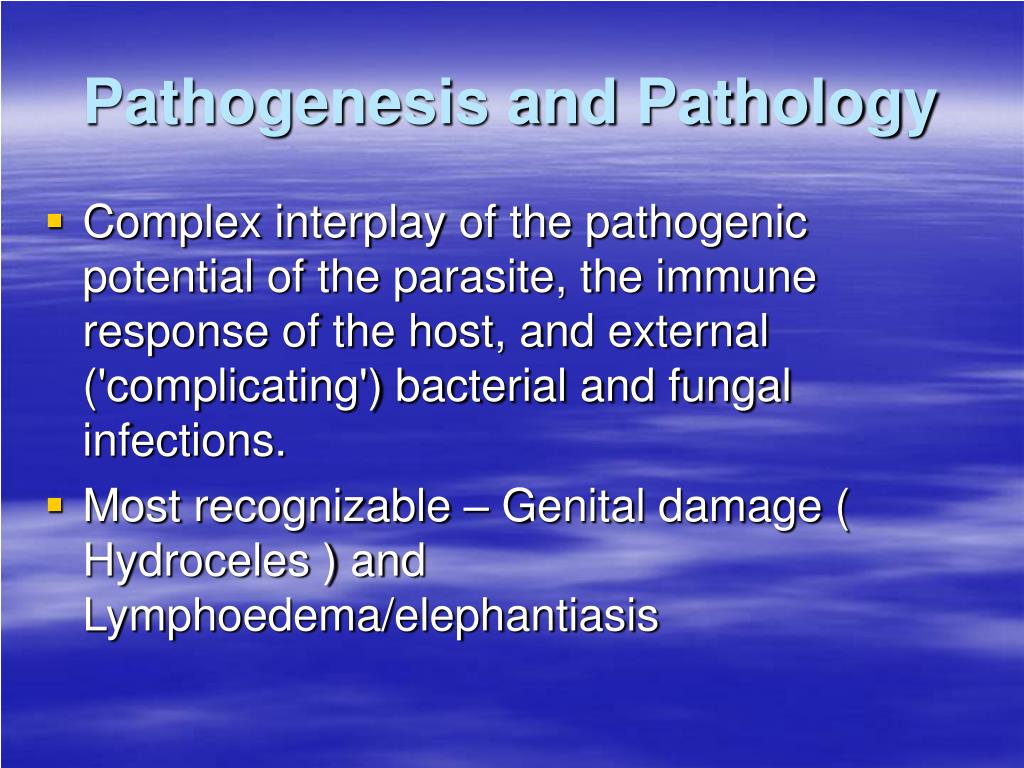Pathogenesis and Pathology • Complex interplay of the pathogenic potential of the parasite, the immune response of the host, and external ('complicating') bacterial and fungal infections. • Most recognizable – Genital damage ( Hydroceles ) and Lymphoedema/elephantiasis