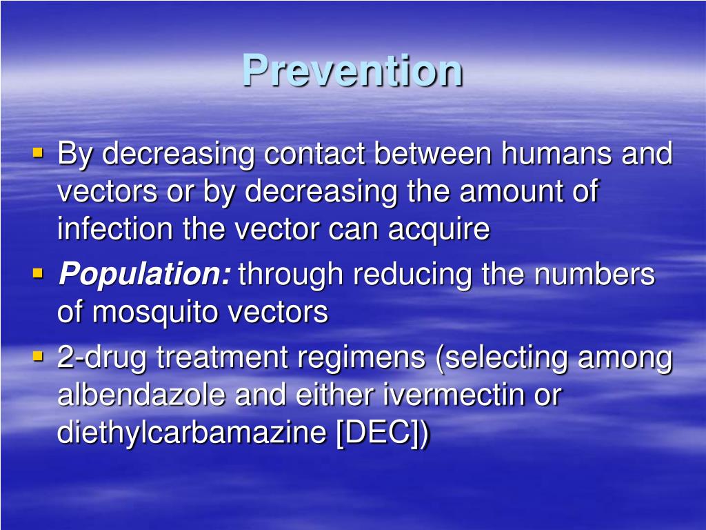 Prevention • By decreasing contact between humans and vectors or by decreasing the amount of infection the vector can acquire • Population: through reducing the numbers of mosquito vectors • 2-drug treatment regimens (selecting among albendazole and either ivermectin or diethylcarbamazine [DEC])