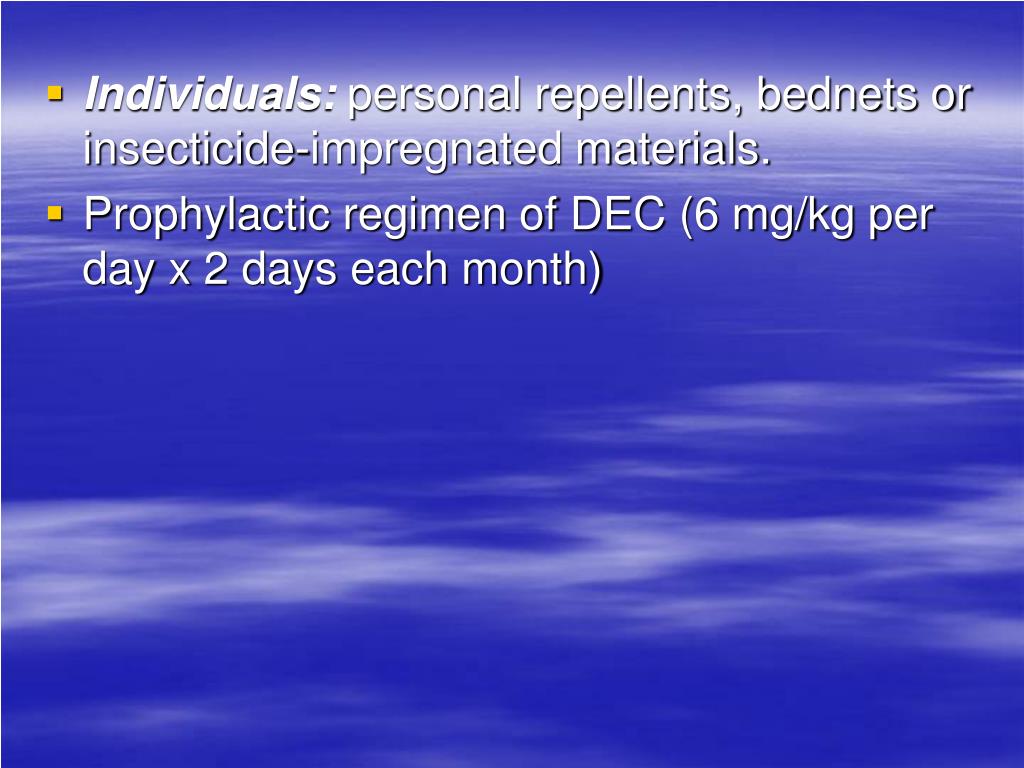 Individuals: personal repellents, bednets or insecticide-impregnated materials. • Prophylactic regimen of DEC (6 mg/kg per day x 2 days each month)