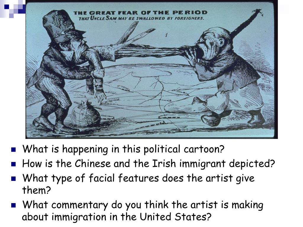What is happening in this political cartoon? How is the Chinese and the Irish immigrant depicted? What type of facial features does the artist give them? What commentary do you think the artist is making about immigration in the United States?
