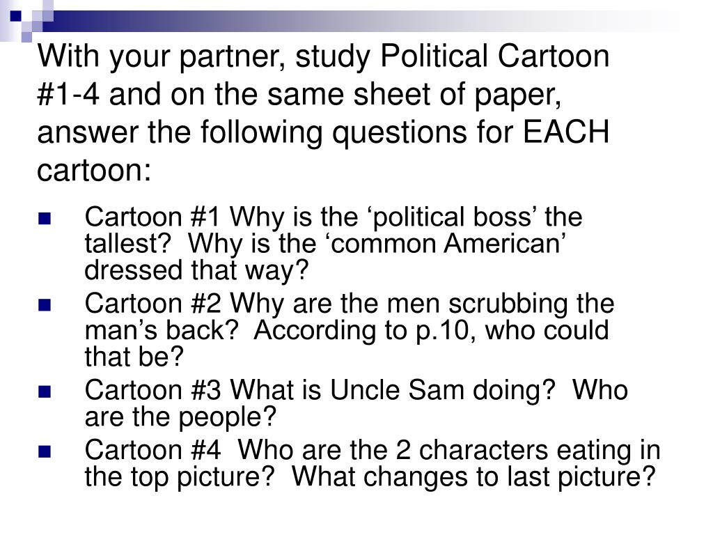 With your partner, study Political Cartoon #1-4 and on the same sheet of paper, answer the following questions for EACH cartoon: • Cartoon #1 Why is the ‘political boss’ the tallest? Why is the ‘common American’ dressed that way? • Cartoon #2 Why are the men scrubbing the man’s back? According to p.10, who could that be? • Cartoon #3 What is Uncle Sam doing? Who are the people? • Cartoon #4 Who are the 2 characters eating in the top picture? What changes to last picture?