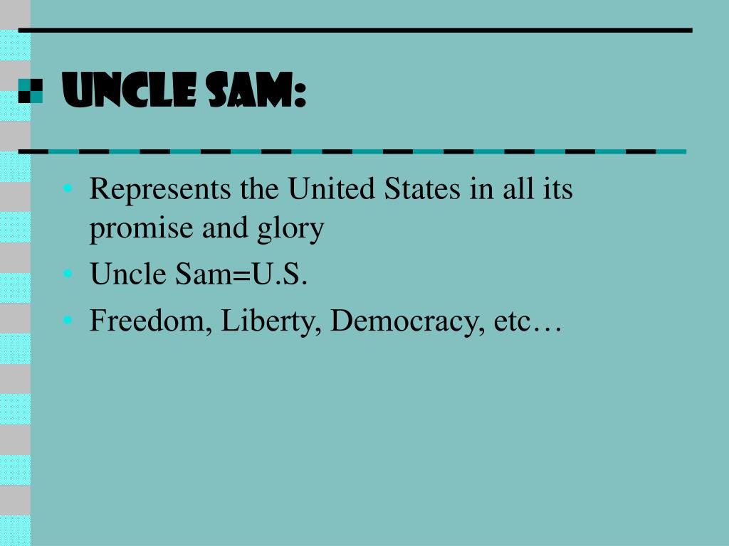 Uncle Sam: • Represents the United States in all its promise and glory • Uncle Sam=U.S. • Freedom, Liberty, Democracy, etc…