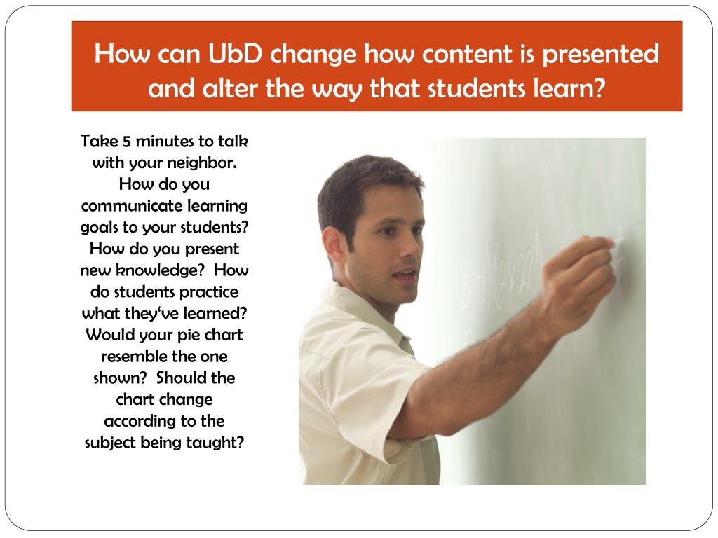 How can UbD change how content is presented and alter the way that students learn? Take 5 minutes to talk with your neighbor. How do you communicate learning goals to your students? How do you present new knowledge? How do students practice what they‘ve learned? Would your pie chart resemble the one shown? Should the chart change according to the subject being taught?