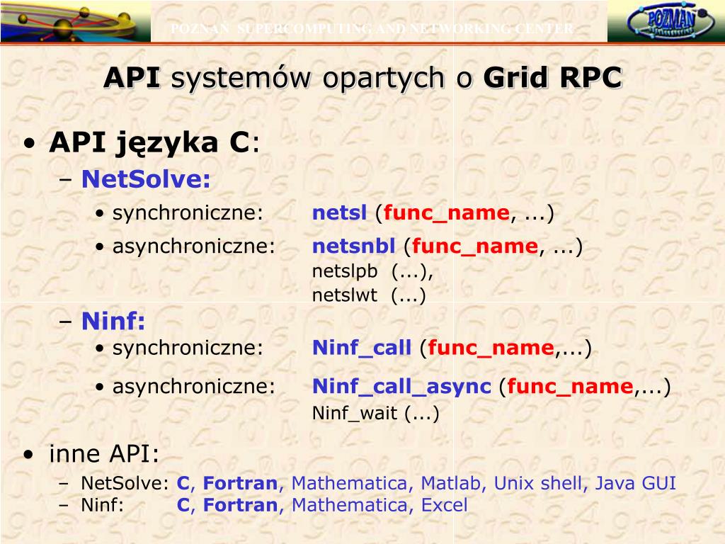 API systemów opartych o Grid RPC • API języka C: • NetSolve: • synchroniczne: netsl (func_name, ...) • asynchroniczne: netsnbl (func_name, ...)netslpb (...),netslwt (...) • Ninf: • synchroniczne: Ninf_call(func_name,...) • asynchroniczne: Ninf_call_async(func_name,...) Ninf_wait (...) • inne API: • NetSolve: C, Fortran, Mathematica, Matlab, Unix shell, Java GUI • Ninf: C, Fortran, Mathematica, Excel