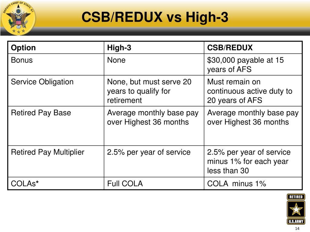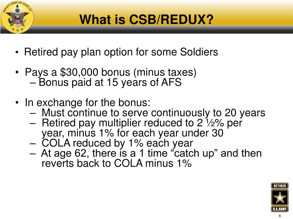 What is CSB/REDUX? • Retired pay plan option for some Soldiers • Pays a $30,000 bonus (minus taxes) • Bonus paid at 15 years of AFS • In exchange for the bonus: • Must continue to serve continuously to 20 years • Retired pay multiplier reduced to 2 ½% per • year, minus 1% for each year under 30 • COLA reduced by 1% each year • At age 62, there is a 1 time “catch up” and then • reverts back to COLA minus 1%