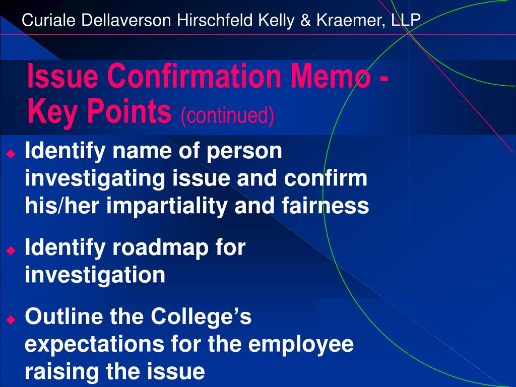 Issue Confirmation Memo -Key Points (continued) • Identify name of person investigating issue and confirm his/her impartiality and fairness • Identify roadmap for investigation • Outline the College’s expectations for theemployee raising the issue