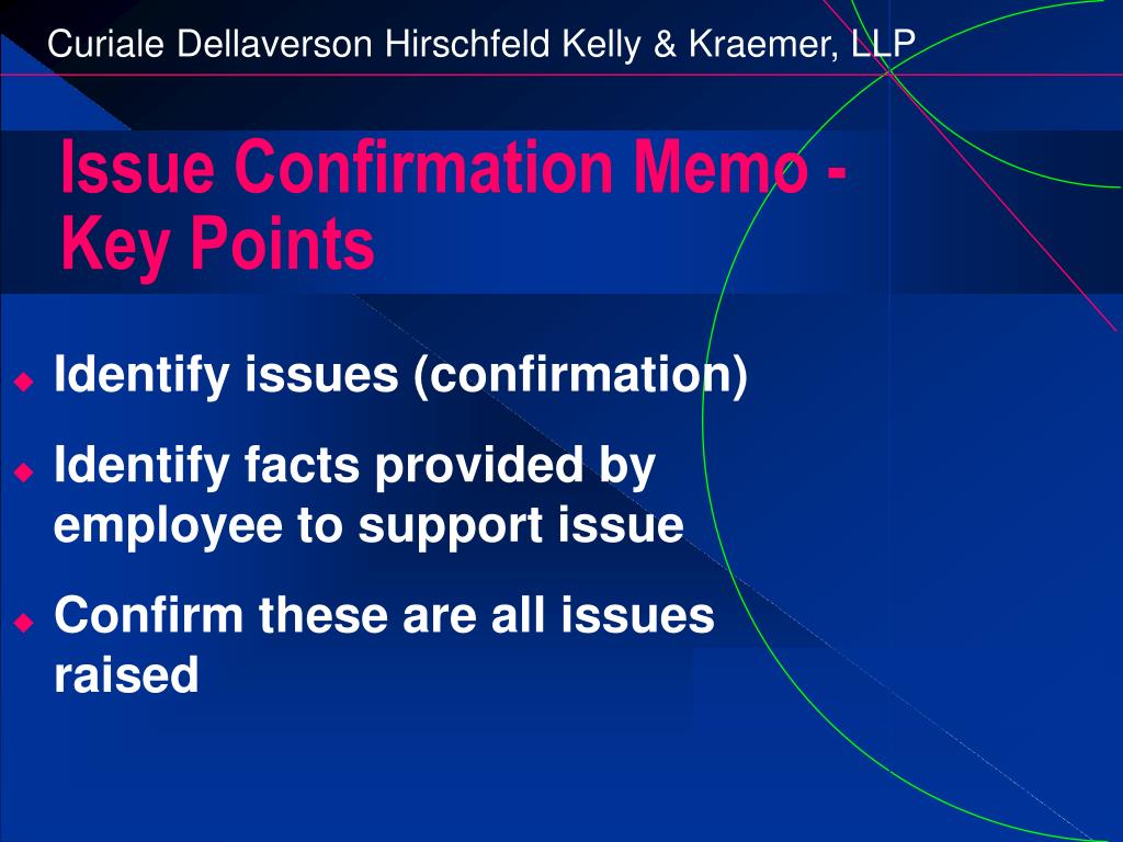 Issue Confirmation Memo -Key Points • Identify issues (confirmation) • Identify facts provided by employee to support issue • Confirm these are all issues raised
