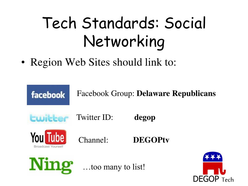 DEGOP Tech Tech Standards: Social Networking • Region Web Sites should link to: Facebook Group: Delaware Republicans Twitter ID: degop Channel: DEGOPtv …too many to list!