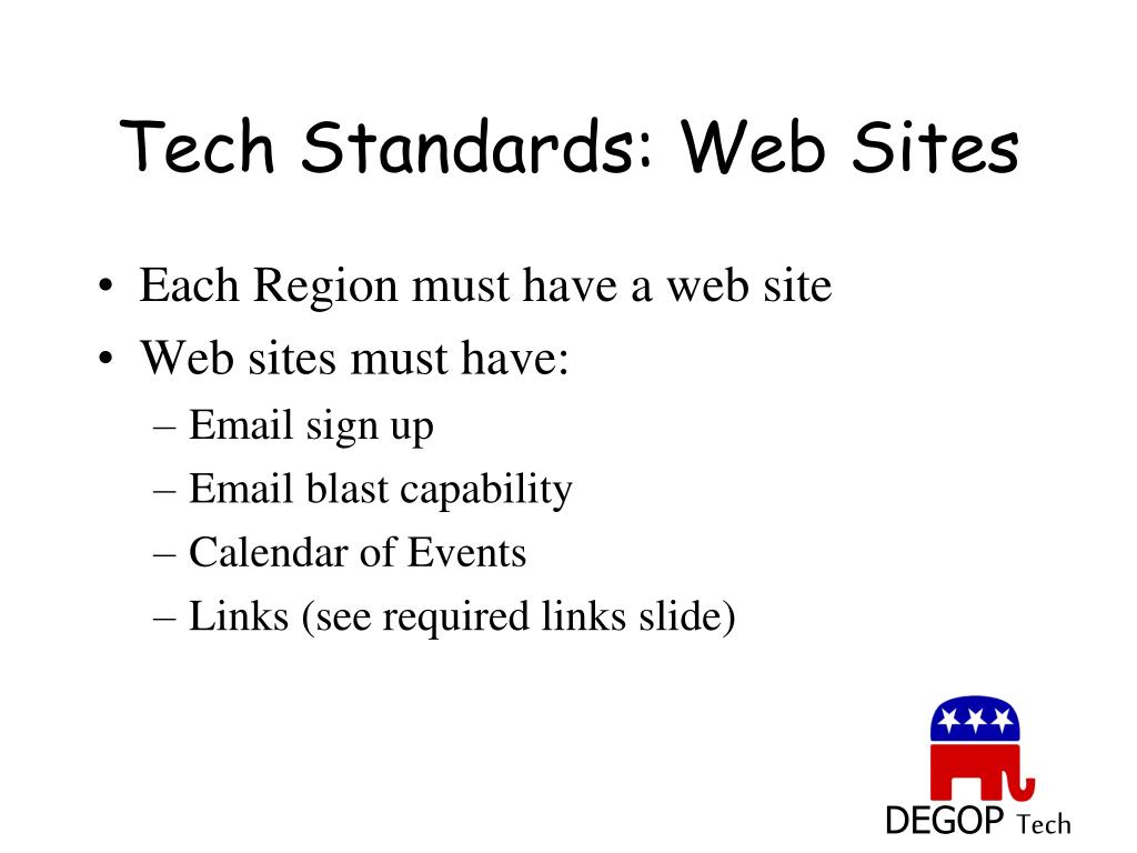 DEGOP Tech Tech Standards: Web Sites • Each Region must have a web site • Web sites must have: • Email sign up • Email blast capability • Calendar of Events • Links (see required links slide)