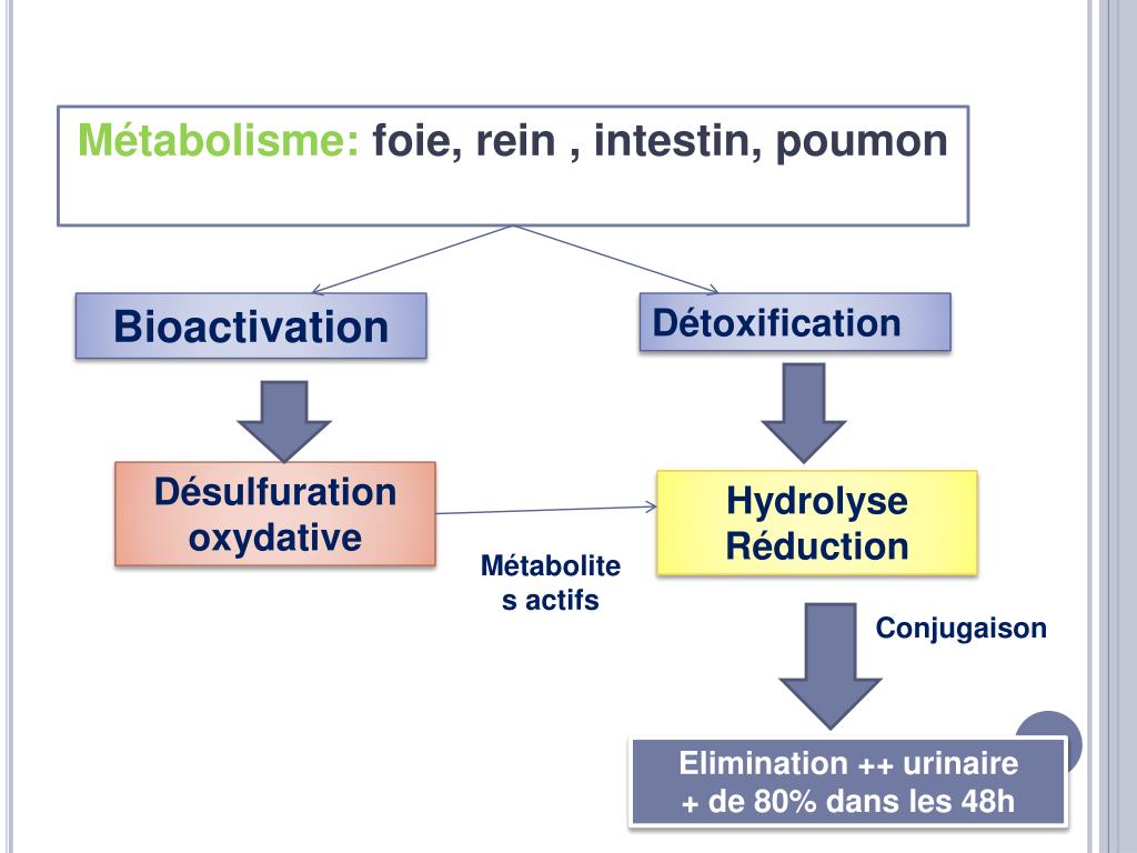 Métabolisme: foie, rein , intestin, poumon Bioactivation Détoxification Désulfuration oxydative Hydrolyse Réduction Métabolites actifs Conjugaison Elimination ++ urinaire + de 80% dans les 48h