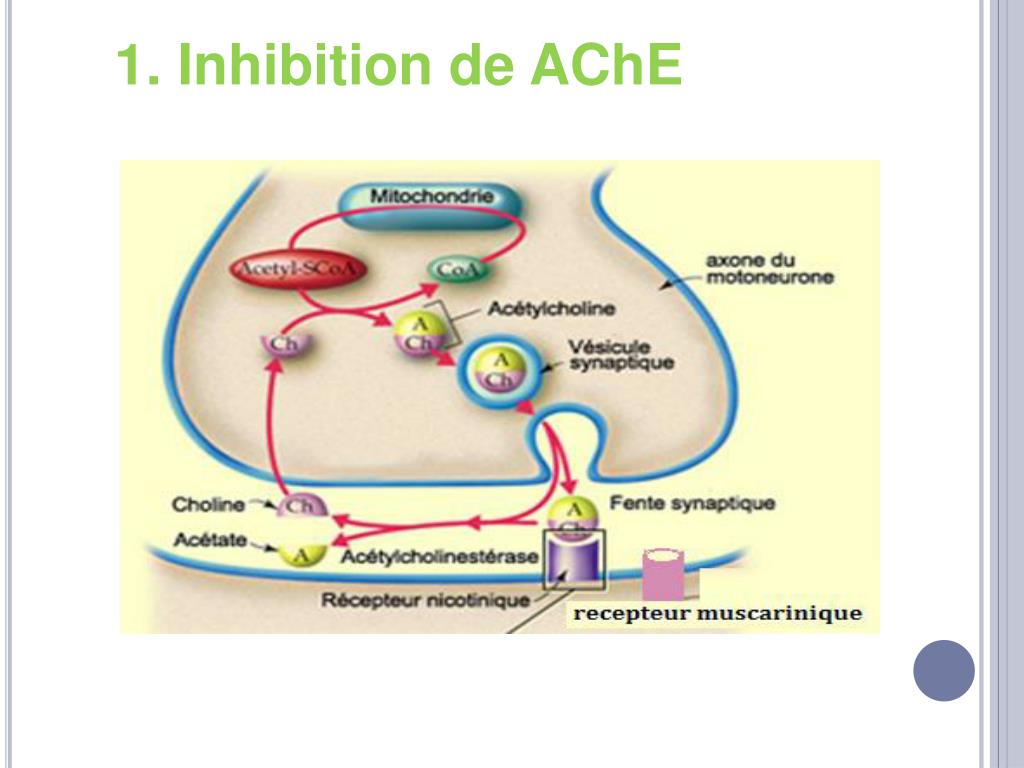 Conséquences Accumulation de ACH au niveau des fentes synaptique Pré ganglionnaires (sympathique et parasympathique ) et post ganglionnaires para JNM SNC Signes cholinergiques