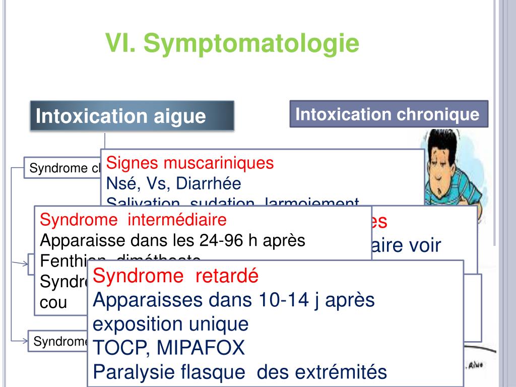 VI. Symptomatologie Intoxication aigue Intoxication chronique Signes muscariniques Nsé, Vs, Diarrhée Salivation, sudation, larmoiement….. Myosis très serré Dyspnée, hypersécrétion bronchique, OAP++ Bradycardie Syndrome classique Effets muscariniques Singes nicotiniques Faiblesse musculaire voir paralysie Effets nicotiniques Syndrome intermédiaire Apparaisse dans les 24-96 h après Fenthion, diméthoate Syndrome paralytique des membres et cou Syndrome intermédiaire Syndrome retardé Apparaisses dans 10-14 j après exposition unique TOCP, MIPAFOX Paralysie flasque des extrémités Atteinte du SNC Vertiges, céphalées, convulsion et coma Symptômes SNC Syndrome retardé