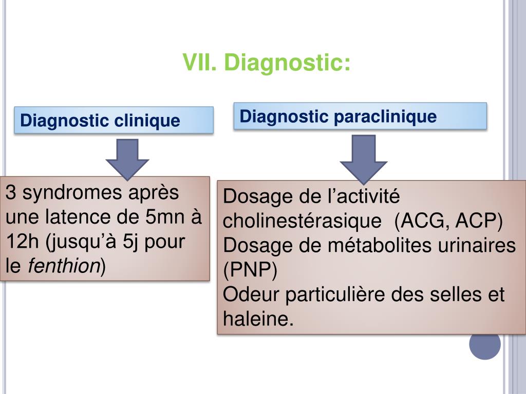 VII. Diagnostic: Diagnostic paraclinique Diagnostic clinique 3 syndromes après une latence de 5mn à 12h (jusqu’à 5j pour le fenthion) Dosage de l’activité cholinestérasique (ACG, ACP) Dosage de métabolites urinaires (PNP) Odeur particulière des selles et haleine.