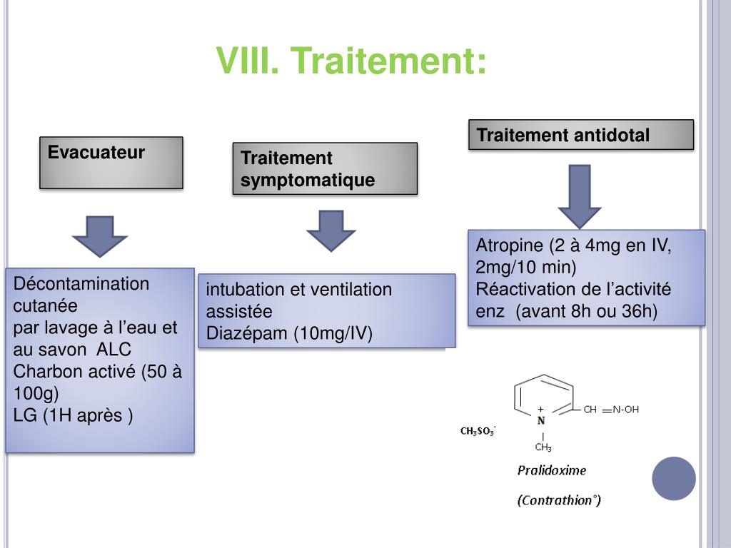 VIII. Traitement: Traitement antidotal Evacuateur Traitement symptomatique Atropine (2 à 4mg en IV, 2mg/10 min) Réactivation de l’activité enz (avant 8h ou 36h) Décontamination cutanée par lavage à l’eau et au savon ALC Charbon activé (50 à 100g) LG (1H après ) intubation et ventilation assistée Diazépam (10mg/IV)