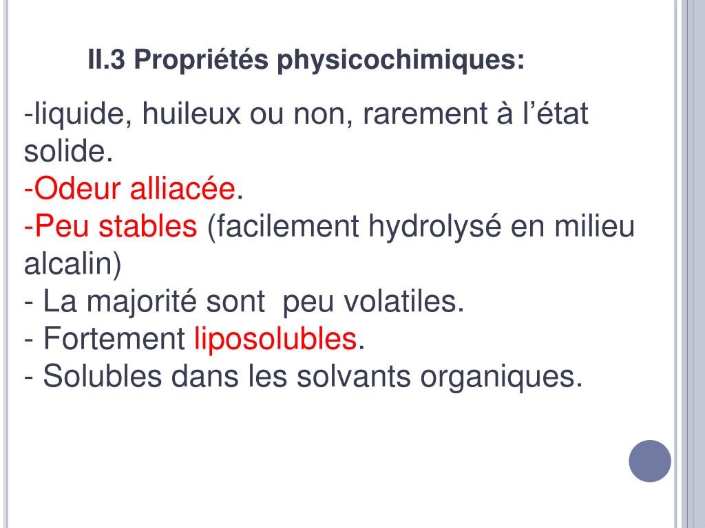 II.3 Propriétés physicochimiques: • liquide, huileux ou non, rarement à l’état solide. • Odeur alliacée. • Peu stables (facilement hydrolysé en milieu alcalin) • - La majorité sont peu volatiles. • - Fortement liposolubles. • - Solubles dans les solvants organiques.