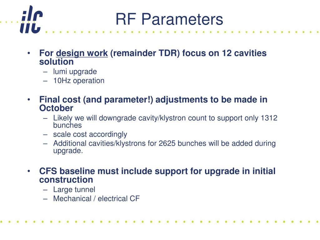 RF Parameters • For design work (remainder TDR) focus on 12 cavities solution • lumi upgrade • 10Hz operation • Final cost (and parameter!) adjustments to be made in October • Likely we will downgrade cavity/klystron count to support only 1312 bunches • scale cost accordingly • Additional cavities/klystrons for 2625 bunches will be added during upgrade. • CFS baseline must include support for upgrade in initial construction • Large tunnel • Mechanical / electrical CF
