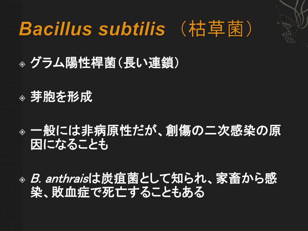 Bacillus subtilis (枯草菌) • グラム陽性桿菌(長い連鎖) • 芽胞を形成 • 一般には非病原性だが、創傷の二次感染の原因になることも • B. anthraisは炭疽菌として知られ、家畜から感染、敗血症で死亡することもある