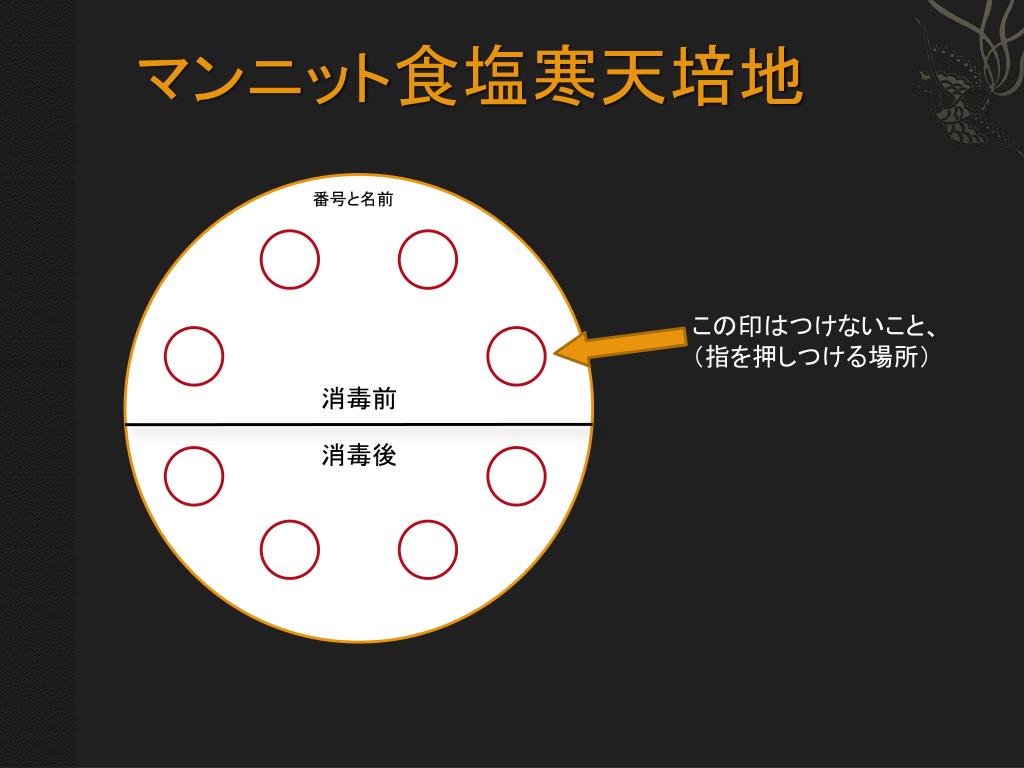 マンニット食塩寒天培地 番号と名前 この印はつけないこと、(指を押しつける場所) 消毒前 消毒後