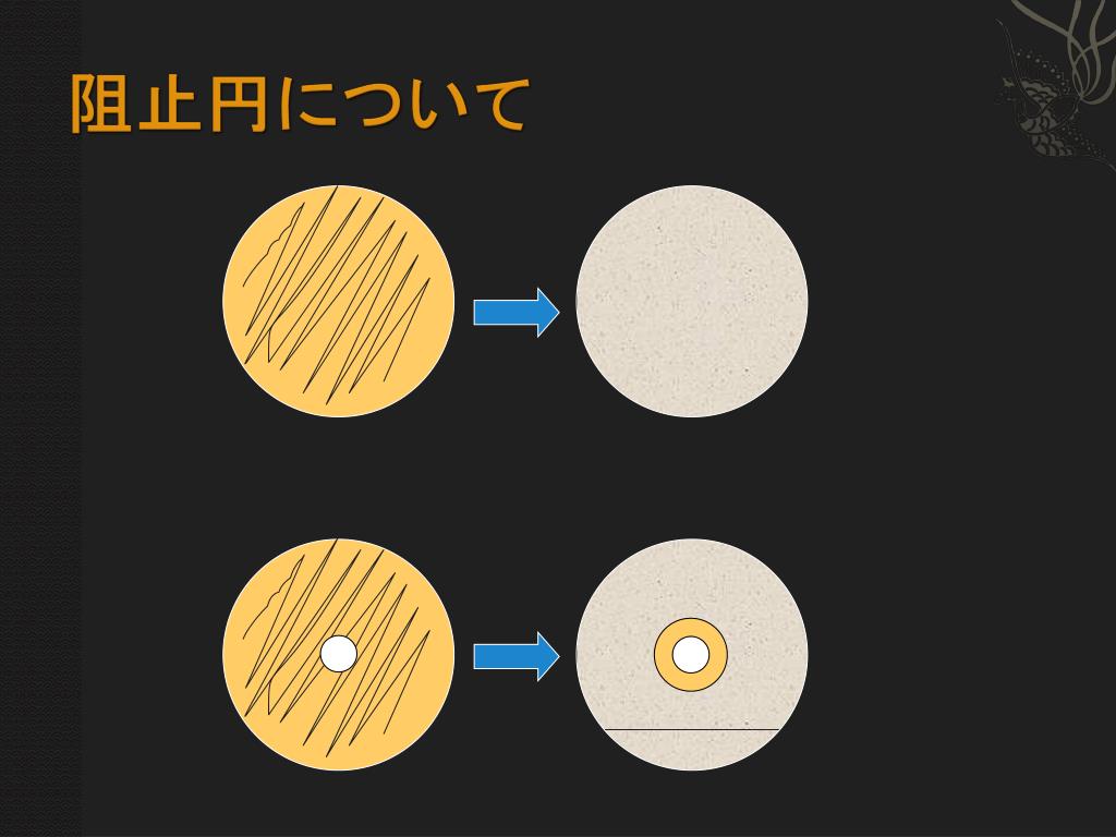 阻止円の測定 ディスク 完全阻止帯 寒天平板培地 阻止円の直径は、完全阻止帯の直径とする。