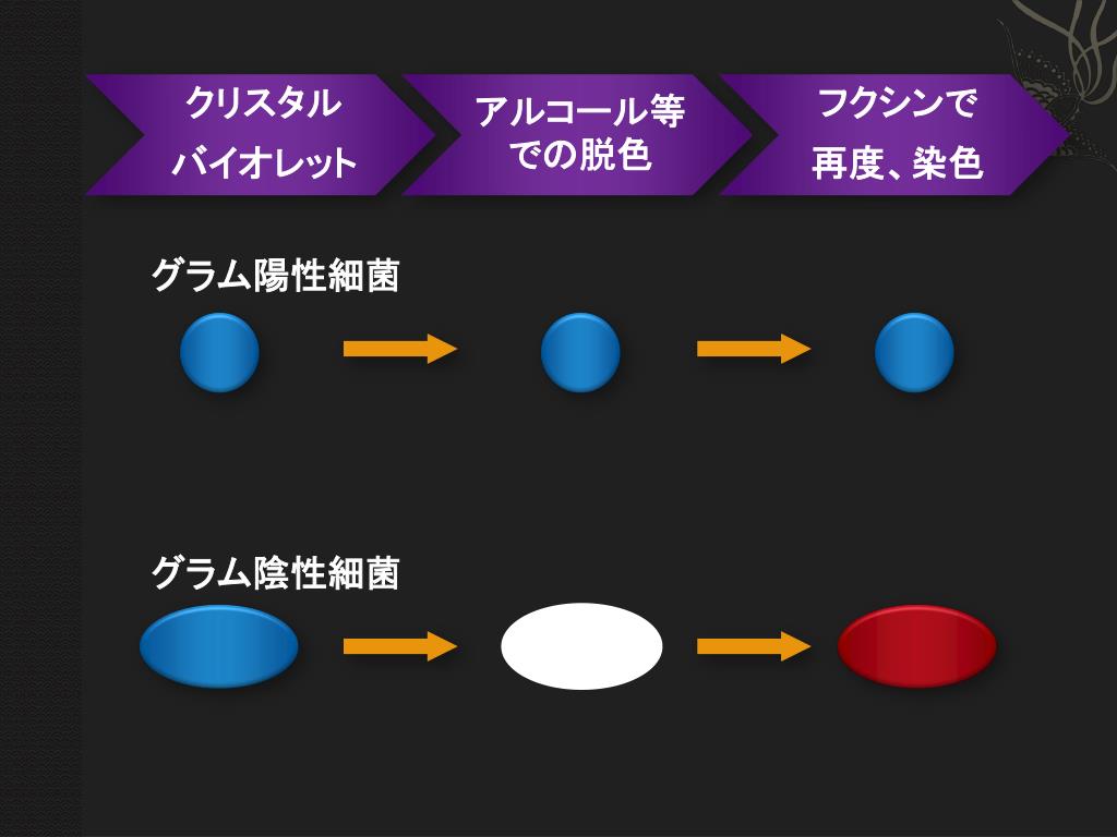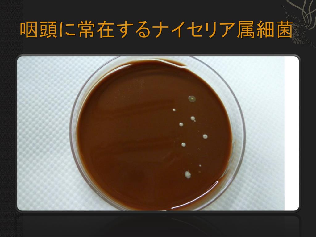 マンニット 食塩寒天培地. 番号と名前. この印はつけないこと、(指を押しつける場所). 消毒前. 消毒後. 手洗い前後における細菌の比較. 黄色ブドウ球菌. その他のブドウ球菌( CNS ). 黄色のコロニー. 手洗いが不十分. グラム陽性細菌. グラム陰性細菌. 染色結果. 青色:グラム陽性細菌 赤色:グラム陰性細菌. 咽頭に常在する黄色ブドウ球菌. 咽頭に常在するナイセリア属細菌. 口腔内に存在する髄膜炎菌. 羊血液寒天培地. α 溶血. β 溶血. バシトラシン添加チョコレート寒天培地. 乳糖分解について. 乳糖非分解菌の場合.