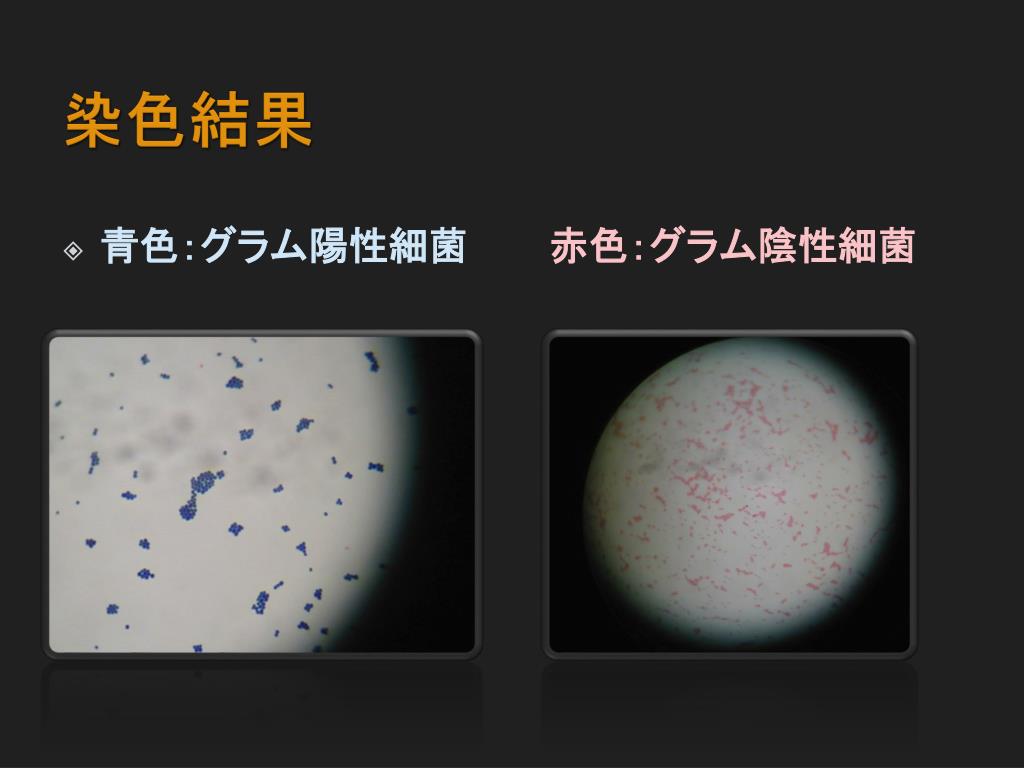 染色結果 • 青色:グラム陽性細菌赤色:グラム陰性細菌
