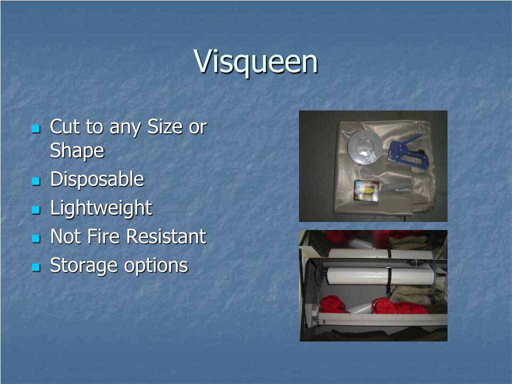 Visqueen • Cut to any Size or Shape • Disposable • Lightweight • Not Fire Resistant • Storage options
