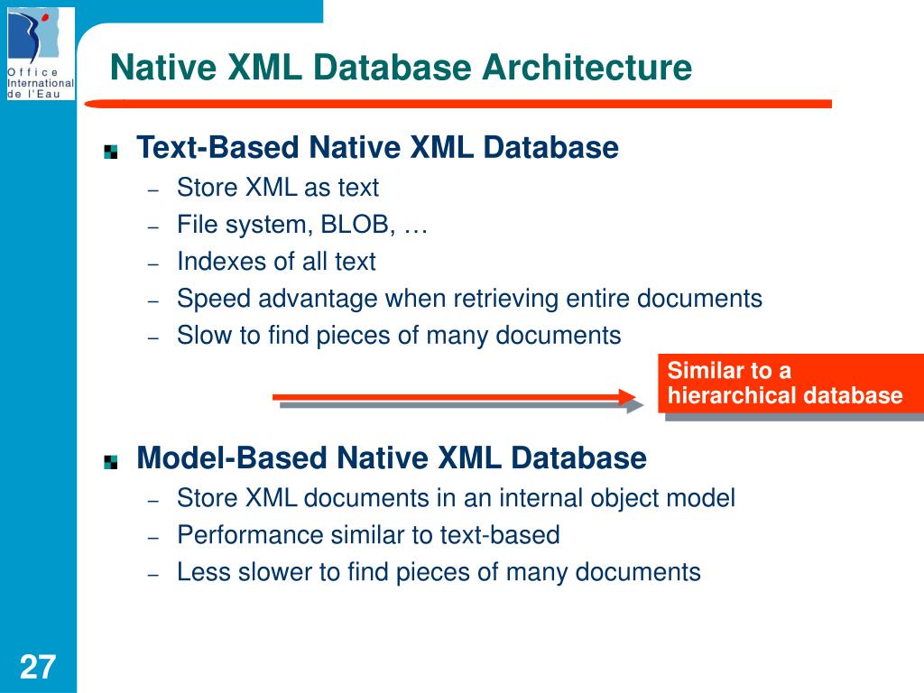 Links about XML Databases • XML family : www.w3c.org • Introduction to native XML database : http://www.xml.com/pub/a/2001/10/31/nativexmldb.html • History of XML database : http://www.eaijournal.com/PDF/XMLMcGoveran.pdf • XQuery : http://www.xml.com/pub/a/2002/10/16/xquery.html • Oracle : http://www.oracle.com/technology/tech/xml/index.html • Tamino : http://www1.softwareag.com/Corporate/products/tamino/default.asp • XIndice : http://xml.apache.org/xindice/ • eXist : http://exist.sourceforge.net/ • SANDRE : www.sandre.eaufrance.fr • XML-EAU : http://www.sandre.eaufrance.fr/francais/frame/sagen.htm?page=../../xmleau/index.html