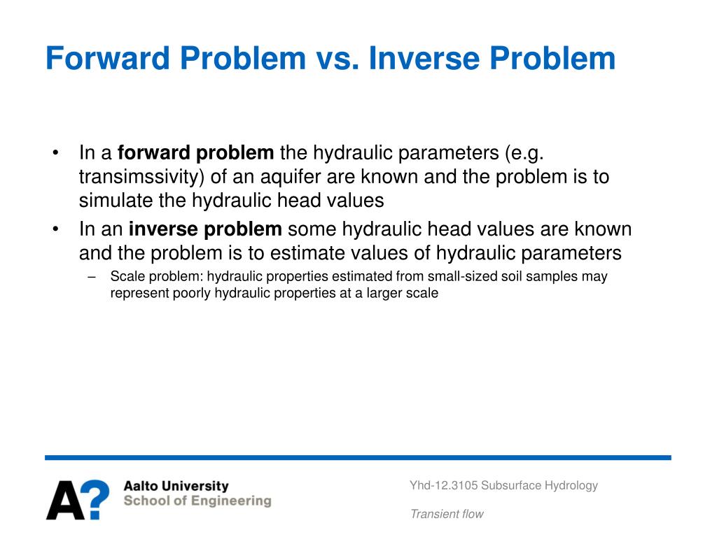 ForwardProblem vs. InverseProblem • In a forwardproblem the hydraulicparameters (e.g. transimssivity) of an aquiferareknown and the problem is to simulate the hydraulicheadvalues • In an inverseproblemsomehydraulicheadvaluesareknown and the problem is to estimatevalues of hydraulicparameters • Scale problem: hydraulic properties estimated from small-sized soil samples may represent poorly hydraulic properties at a larger scale