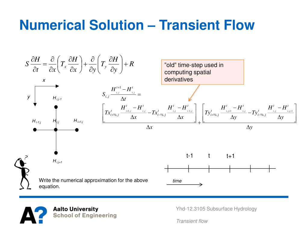 t-1 t t+1 NumericalSolution – TransientFlow time ”old” time-stepused in computingspatialderivatives x y Write the numericalapproximation for the aboveequation.