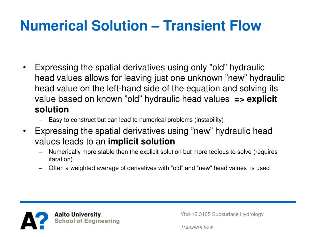NumericalSolution – TransientFlow • Expressing the spatialderivativesusingonly ”old” hydraulicheadvaluesallows for leaving just oneunknown ”new” hydraulicheadvalue on the left-hand side of the equation and solvingitsvaluebased on known ”old” hydraulicheadvalues=> explicitsolution • Easy to constructbutcanlead to numericalproblems (instability) • Expressing the spatialderivativesusing ”new” hydraulicheadvaluesleads to an implicitsolution • Numericallymorestablethen the explicitsolutionbutmoretedious to solve (requiresitaration) • Often a weightedaverage of derivativeswith ”old” and ”new” headvalues is used