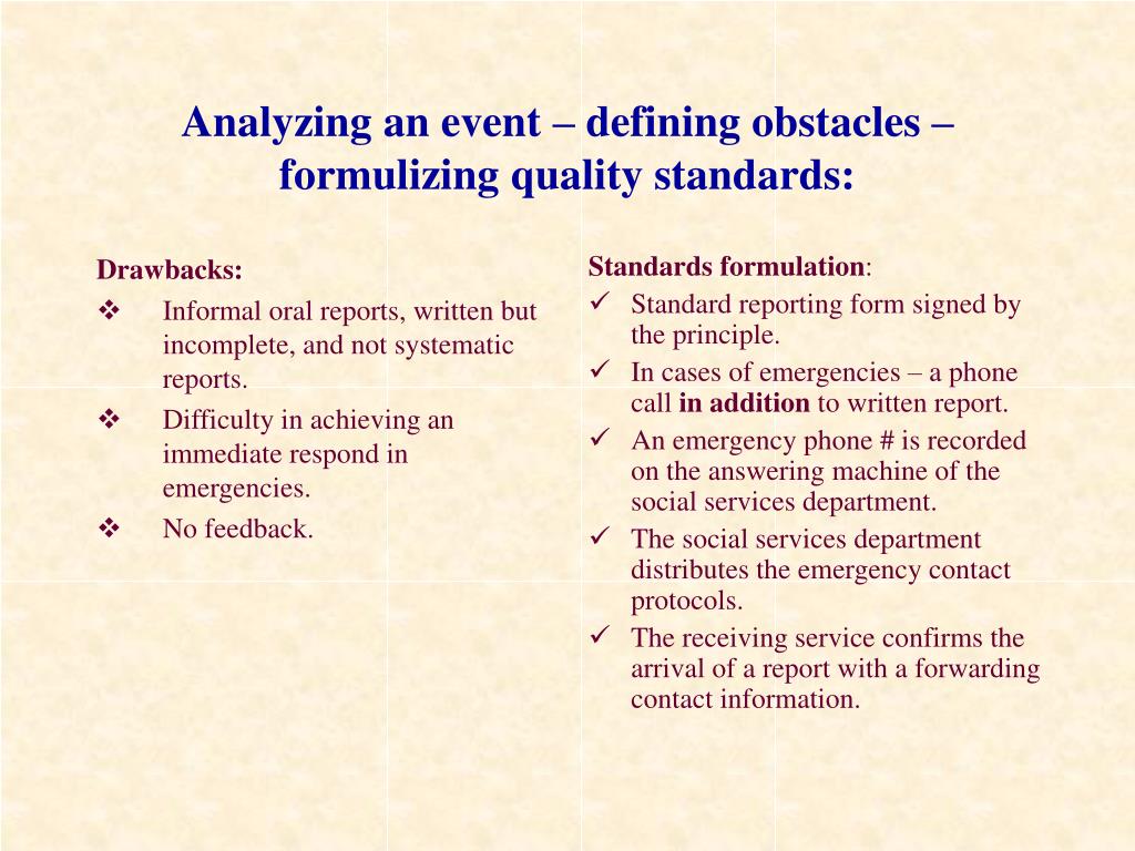 Drawbacks: Informal oral reports, written but incomplete, and not systematic reports. Difficulty in achieving an immediate respond in emergencies. No feedback. Standards formulation: Standard reporting form signed by the principle. In cases of emergencies – a phone call in addition to written report. An emergency phone # is recorded on the answering machine of the social services department. The social services department distributes the emergency contact protocols. The receiving service confirms the arrival of a report with a forwarding contact information. Analyzing an event – defining obstacles – formulizing quality standards: