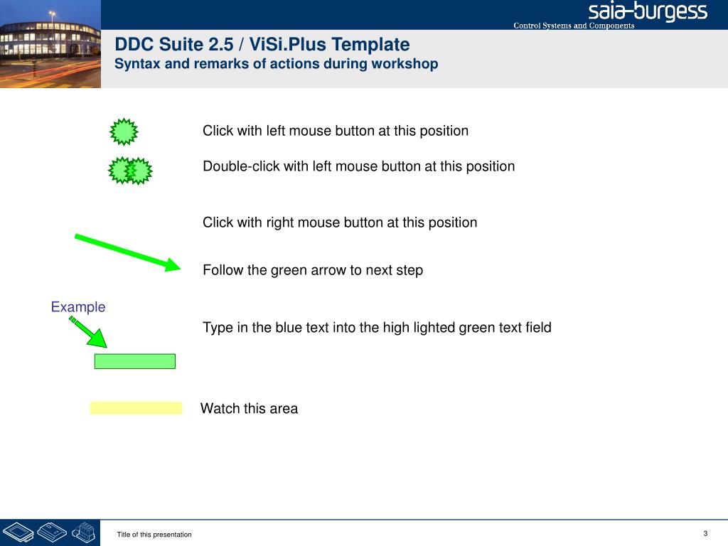 DDC Suite 2.5 / ViSi.Plus TemplateSyntax and remarks of actions during workshop • Click with left mouse button at this position • Double-click with left mouse button at this position • Click with right mouse button at this position • Follow the green arrow to next step • Example • Type in the blue text into the high lighted green text field • Watch this area Title of this presentation