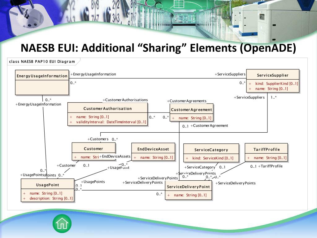 NAESB Energy Usage Information Model • Establishes an information model • Energy Usage Information (EUI) • Harmonizing the following (to the extent possible): • SEP 2.0, OpenADE, EIS Alliance, IEC (Part-9), C12-19, 61850 • Voluntary, subject to regulatory governing documents • Does not limit function or form (allows any syntax) • Exemplary, not exclusive (allows superset) • For use by implementation specifications • Goal is straightforward (preferably lossless) transformations between conformant specifications • Specifications claiming conformance must describe their transformation (mapping) to the UML model