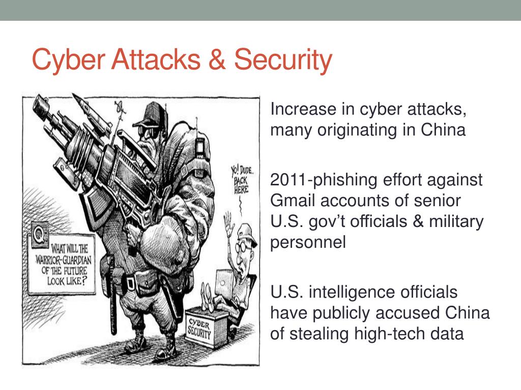 Cyber Attacks & Security Increase in cyber attacks, many originating in China 2011-phishing effort against Gmail accounts of senior U.S. gov’t officials & military personnel U.S. intelligence officials have publicly accused China of stealing high-tech data