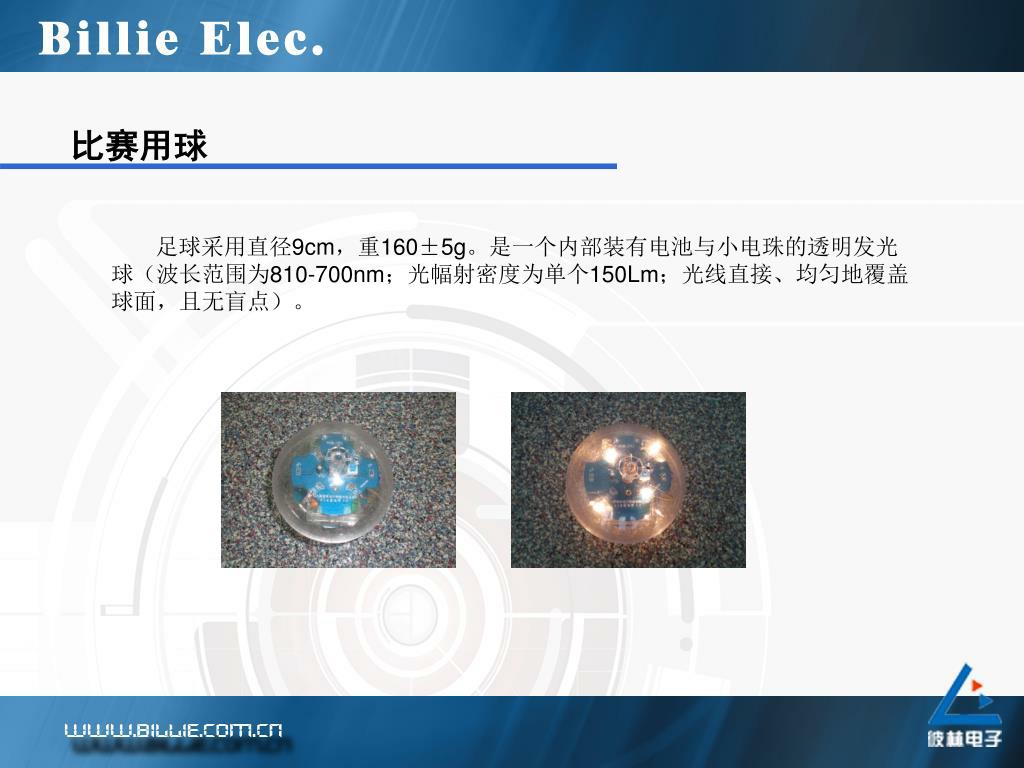 比赛用球 足球采用直径9cm,重160±5g。是一个内部装有电池与小电珠的透明发光球(波长范围为810-700nm;光幅射密度为单个150Lm;光线直接、均匀地覆盖球面,且无盲点)。